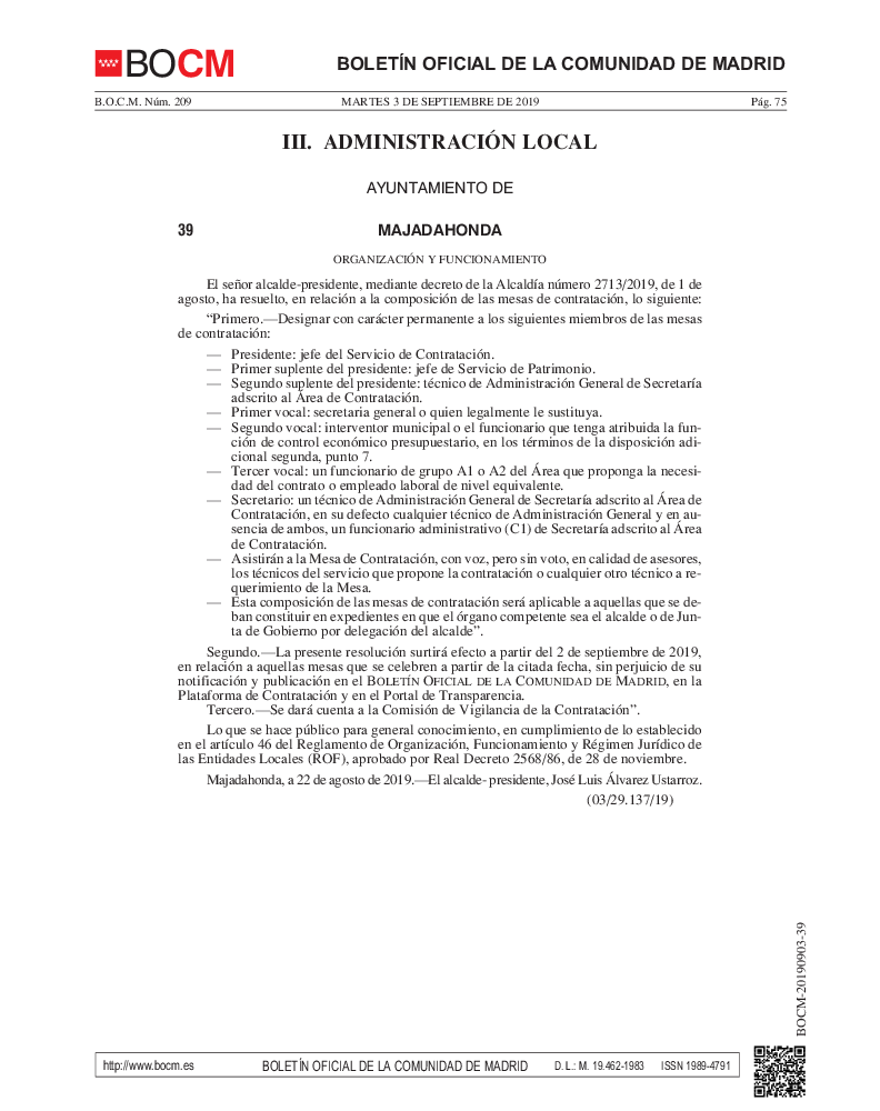 Decreto de Alcaldía Nº2713-2019, de 2 de agosto, publicado en el BOCM Nº209