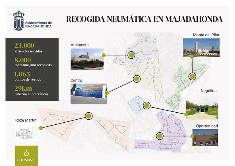 Pionero en la implementación de la recogida neumática de residuos, el ayuntamiento de Majadahonda cuenta con cinco centrales de recogida y ejemplifica cómo mejorar la calidad ambiental y el urbanismo en las ciudades.
